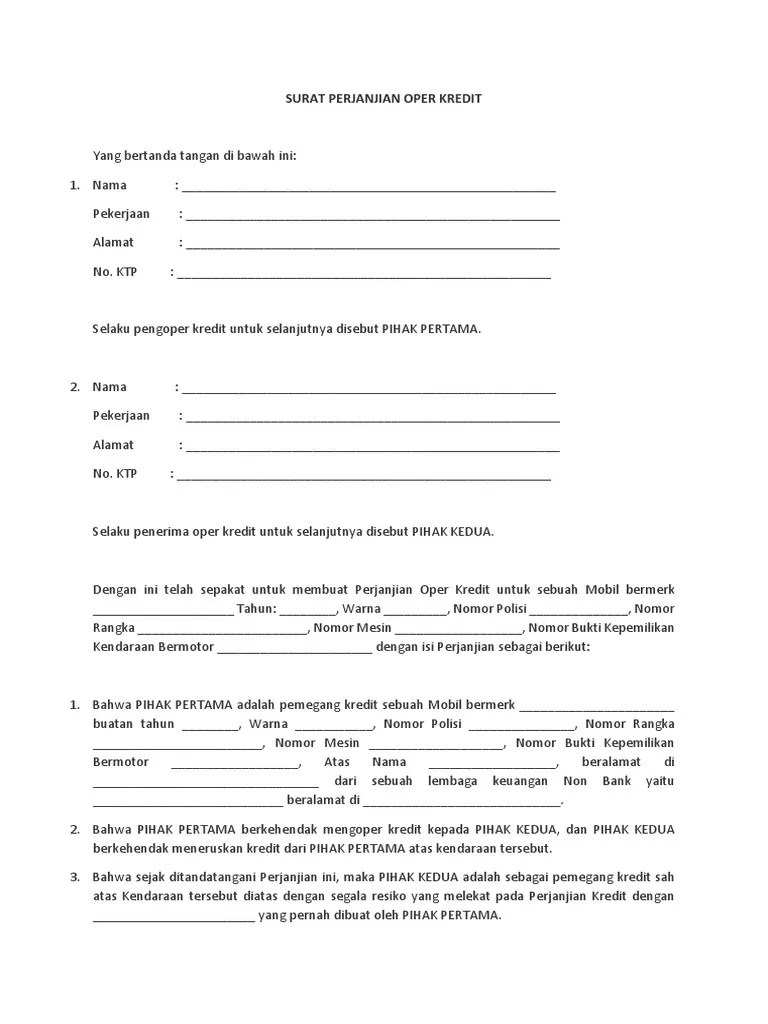 Surat perjanjian over kredit ini penting dibuat apalagi bila over . Download contoh surat over kredit mobil honda jazz. Dan mulai hari ini kendaraan tersebut yang diuraikan dalam surat perjanjian ini menjadi milik pihak kedua dan karenanya segala keuntungan dan . Contoh surat pernyataan perjanjian over kredit rumah. Pasal 7 hak dan kewajiban pihak kedua 1.